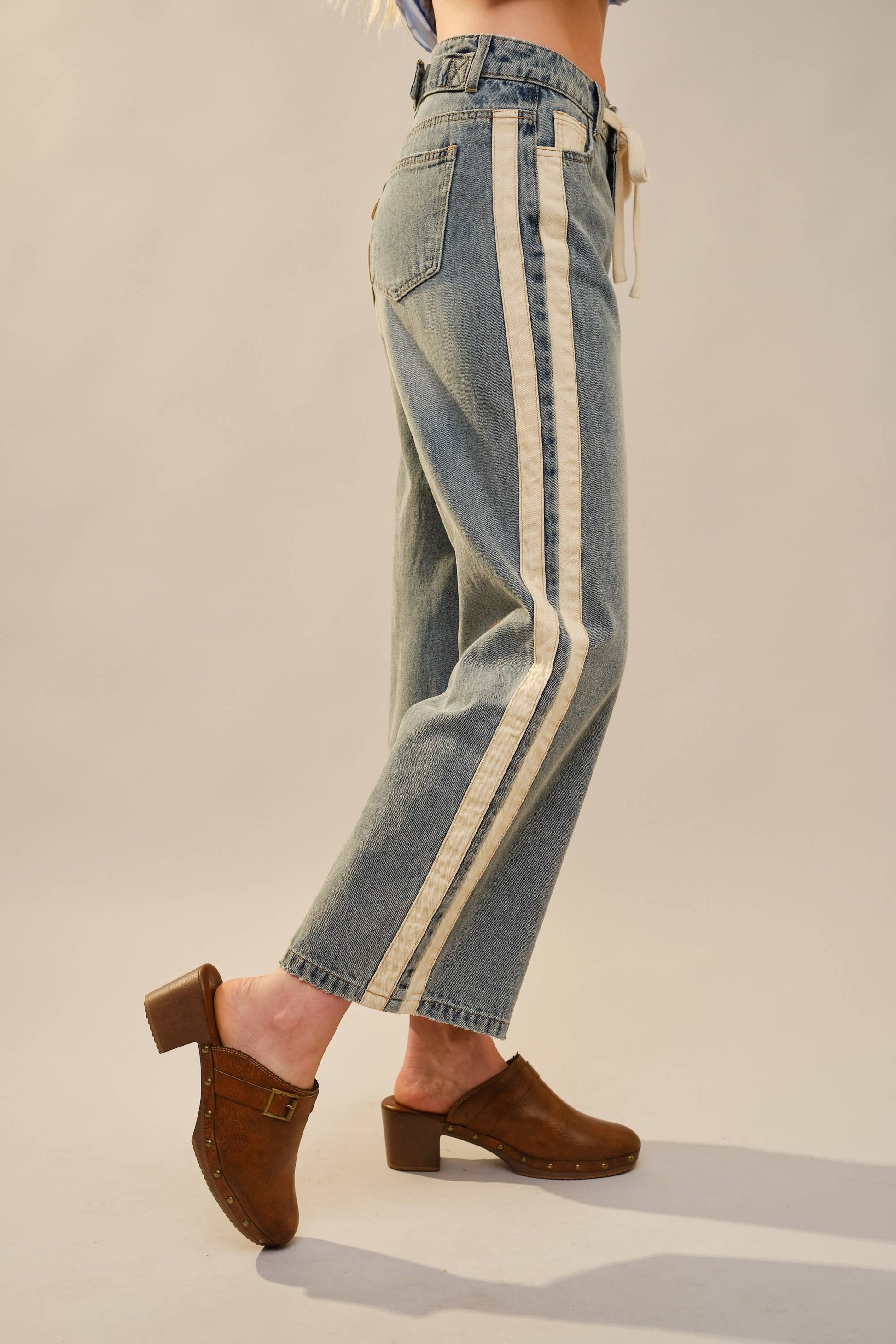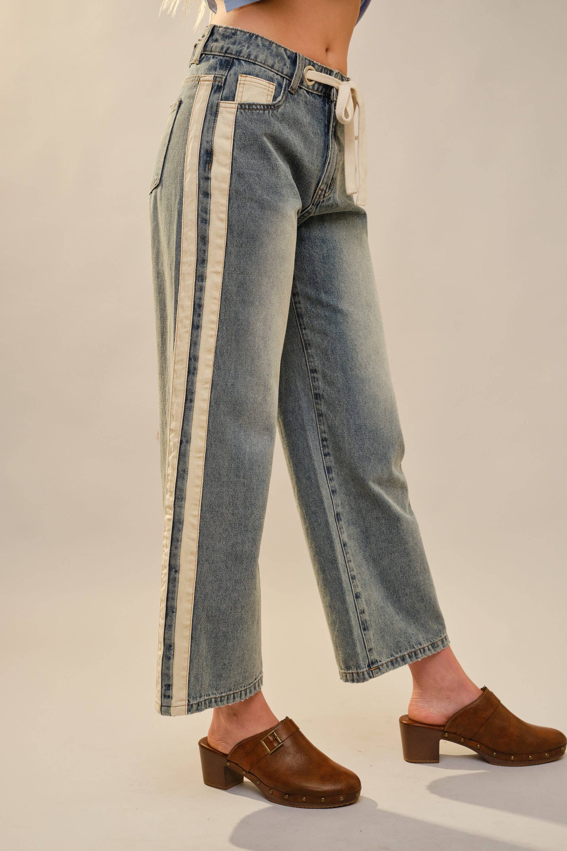 Wide-leg denim jeans featuring bold contrast side panels and distinctive patch pockets that bring vintage charm to your everyday wardrobe. The drawstring waist adjusts for comfort while the slightly cropped length keeps the silhouette modern and effortless. Perfect for pairing with sneakers or boots for that laid-back, retro vibe. 95% Cotton, 5% Viscose Model is 5'8" tall and wearing size Small.