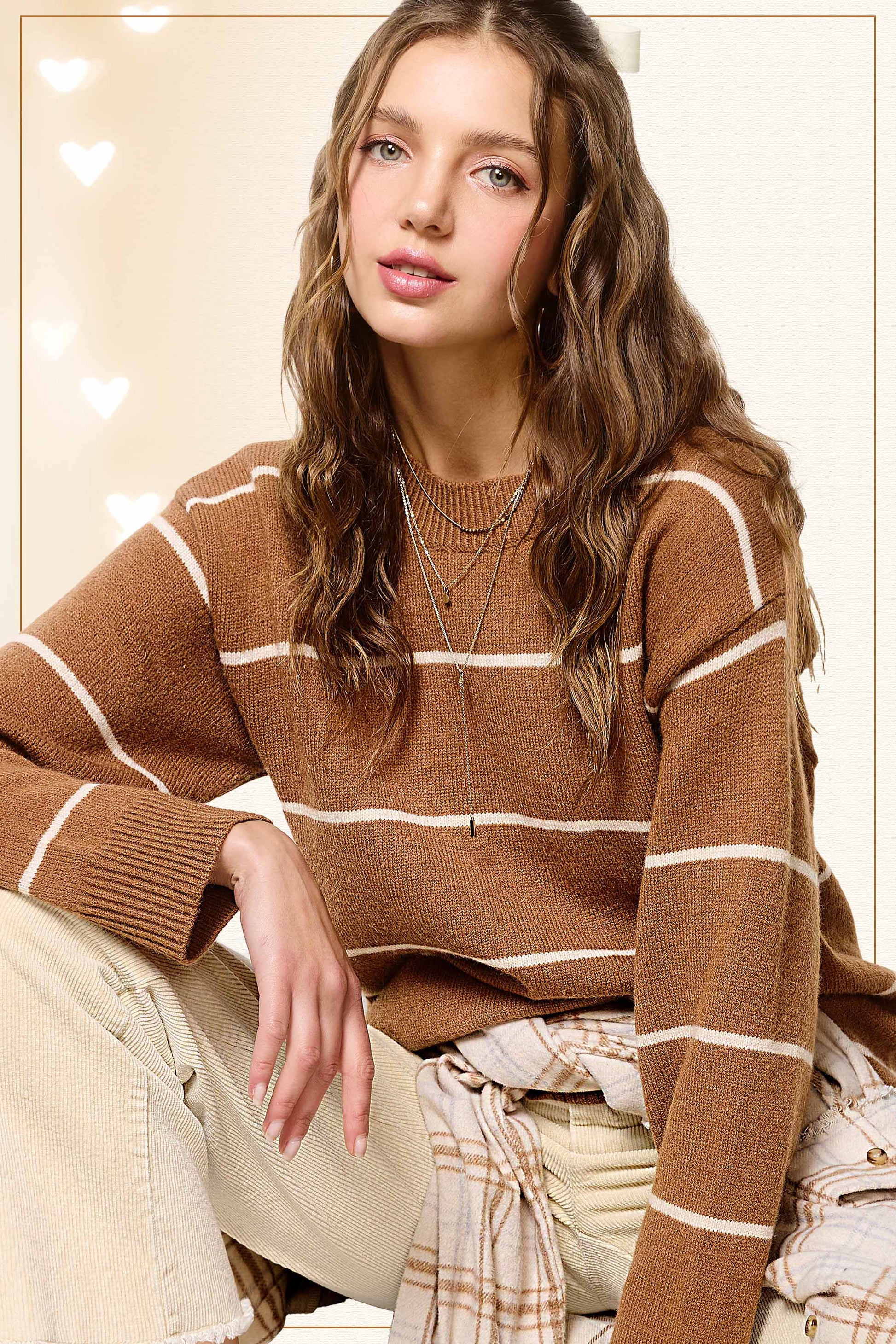 Timeless stripe sweater featured in a loose fit. Sure to be your go-to pullover to take you from season to season, this cool and classic piece is perfect to pair with anything from a skirt to shorts to structured denim.