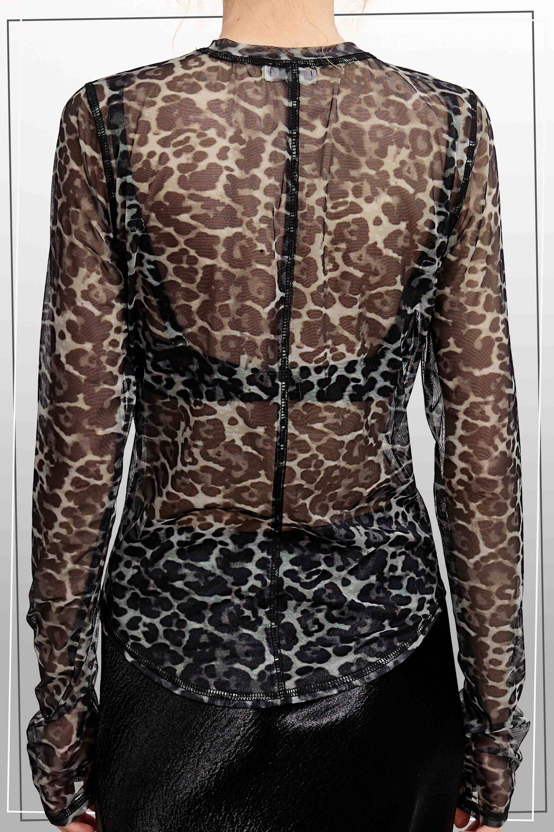 Unleash your wild side with this semi-sheer leopard printed mesh top! The long sleeves and delicate mesh fabric create an effortlessly chic look that's perfect for layering or wearing solo. Bold leopard print adds instant personality to any outfit, while the breathable material keeps you comfortable all day long. Whether you're heading out for a night on the town or just want to add some feline flair to your everyday style, this versatile piece is your new go-to for making a statement.